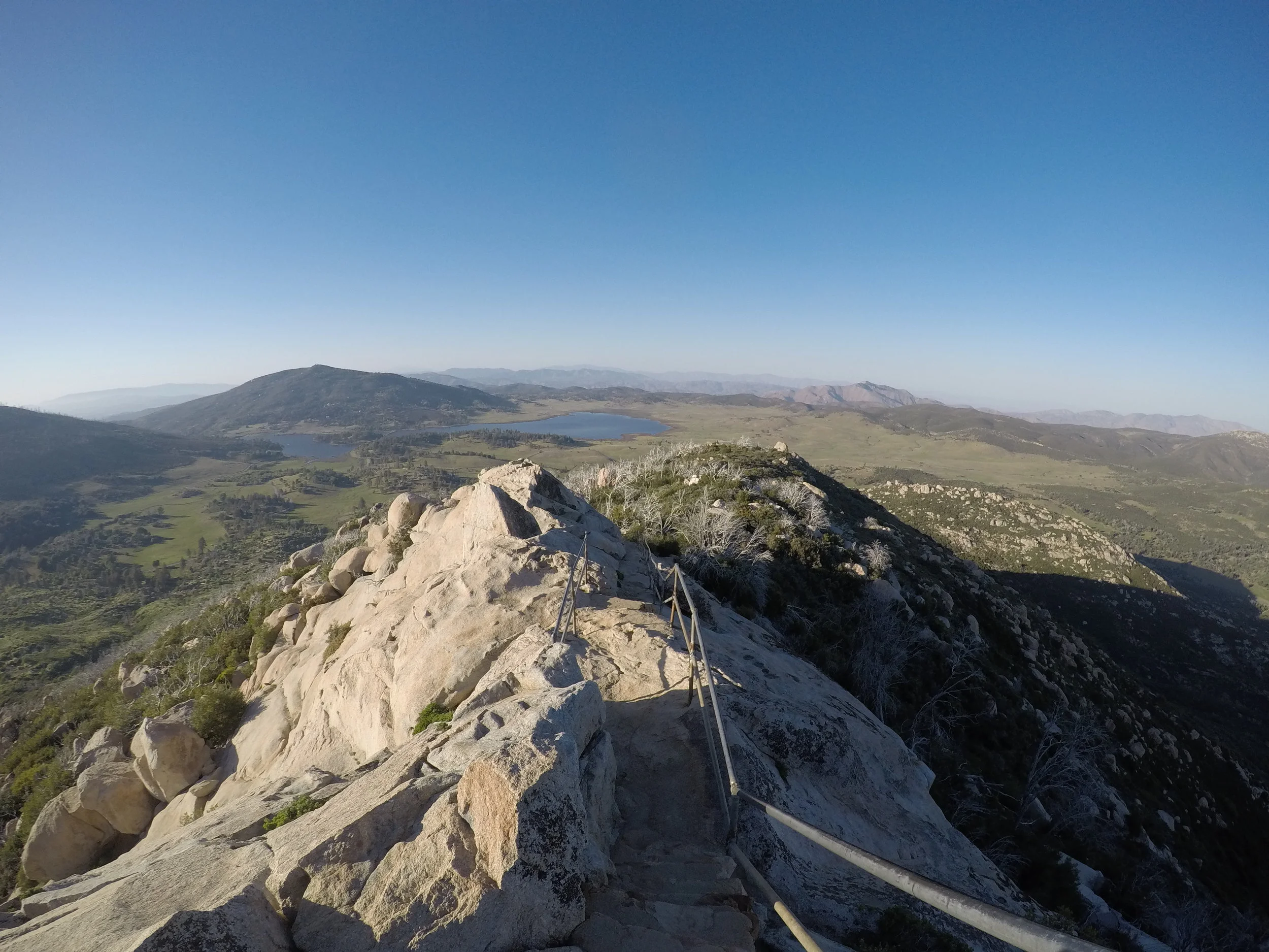 Directions: Stonewall Peak is located in Rancho Cuyamaca State Park, across from the Paso Pichacho campground and day use area, which is where parking is located for the trail. The State Park charges a day use fee to park in the Paso Picacho parking area. From Paso Pichacho, head directly across the street, and you will be on the Stonewall Peak trail. The earlier sections of the hike used to be well-forested, but the Cedar Fire of 2003 burned much of the surrounding area, and more recent fires have left the base exposed. After the first half mile, you will be under tree cover as you swing up and around the switchbacks to the peak. It can get fairly hot in some of the exposed sections during the summer, so do bring plenty of water. The last section of trail (.10 miles) traverses the exposed rock of the eastern ridge of the peak, which can bother people who are afraid of heights, but there is a well-affixed handrail to keep everyone safe. The summit has an amazing three hundred and sixty degree view of the surrounding area, from Lake Cuyamaca to the North, Mt. Cuyamaca to the West, and the Lagunas to the East. And while it is indeed rare, you can see the ocean on a clear day.